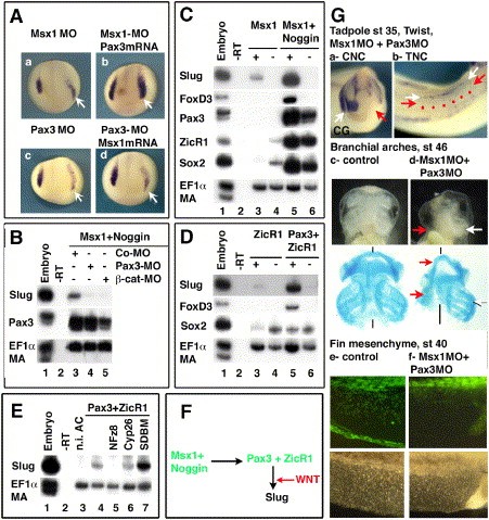 Figure 4. Relationships and Mechanisms of NC Induction by Msx1 and Pax3(A) Epistasis between Msx1 and Pax3 (stage 17 neurulae, dorsal views). When Msx1-MO, which downregulates Slug expression at the neural border (a), is coinjected with Pax3 mRNA (b), Slug expression is restored. The decreased Slug expression observed after injections of Pax3-MO (c) is not rescued by the coinjections of Pax3-MO and Msx1 mRNA (d).(B) RT-PCR analysis on animal caps injected with Msx1 + Noggin in the presence of control (lane 3), Pax3 (lane 4), or β-catenin (lane 5) MOs.(C) In animal cap dissociation assay, Sox2 is induced (lanes 4â6). NC induction observed in nondissociated sibling caps (lanes 5), but not obtained after dissociation (lanes 4 and 6). However, the dissociated cells induce Pax3 and ZicR1 expression (lane 6). Intact animal caps (+), dissociated AC (â).(D) Pax3 + ZicR1 coinjections induce Slug and FoxD3 when the animal caps are intact (lane 5), but not after dissociation (lane6). Intact animal caps (+), dissociated animal caps (â).(E) Pax3 + ZicR1 activation of Slug is blocked by NFz8, but not by cyp26 or a DNA binding mutant of Su(H) (SDBM).(F) Model part 1: Msx1 combined to BMP signaling attenuation activates Pax3 and ZicR1 in explants. Msx1 induction of Slug requires Pax3 activity in vivo and in explants. In turn, Pax3 + ZicR1 are sufficient to activate Slug in vivo and in explants in cooperation with a WNT signal.(G) Phenotype of the double knockdown, Msx1-MO + Pax3-MO. Twist expression is largely depleted in cephalic NC (a, frontal view) and trunk NC (b, white arrows, normal side; red arrows and dots, injected side; dorsal view of the spinal cord). Branchial arch cartilages do not differentiate or are strongly reduced (c and d, ventral views and dissected cartilage). Fin mesenchyme does not form when NC is fluorescently labeled on the injected side (e and f, see Supplemental Data). |