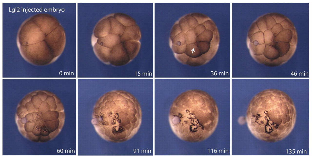 Fig. 6. Time-lapse images showing the gradual but direct depigmentation of the apical side by Lgl2. A pigmented embryo was injected animally with Lgl2 RNA at the two-cell stage and filmed. A small site of cytoplasmic leakage helps to verify the site of injection. Evidence of apical membrane disruption starts as a concentration of pigment spots (arrow) that appear quite suddenly and spread quickly. The even distribution of pigmentation is lost and the pigment is gradually cleared from the apical side. Interestingly, pigment becomes concentrated to the periphery of the apical domain. There is no evidence of inner cells coming to the surface of the embryo or outer cells falling in.