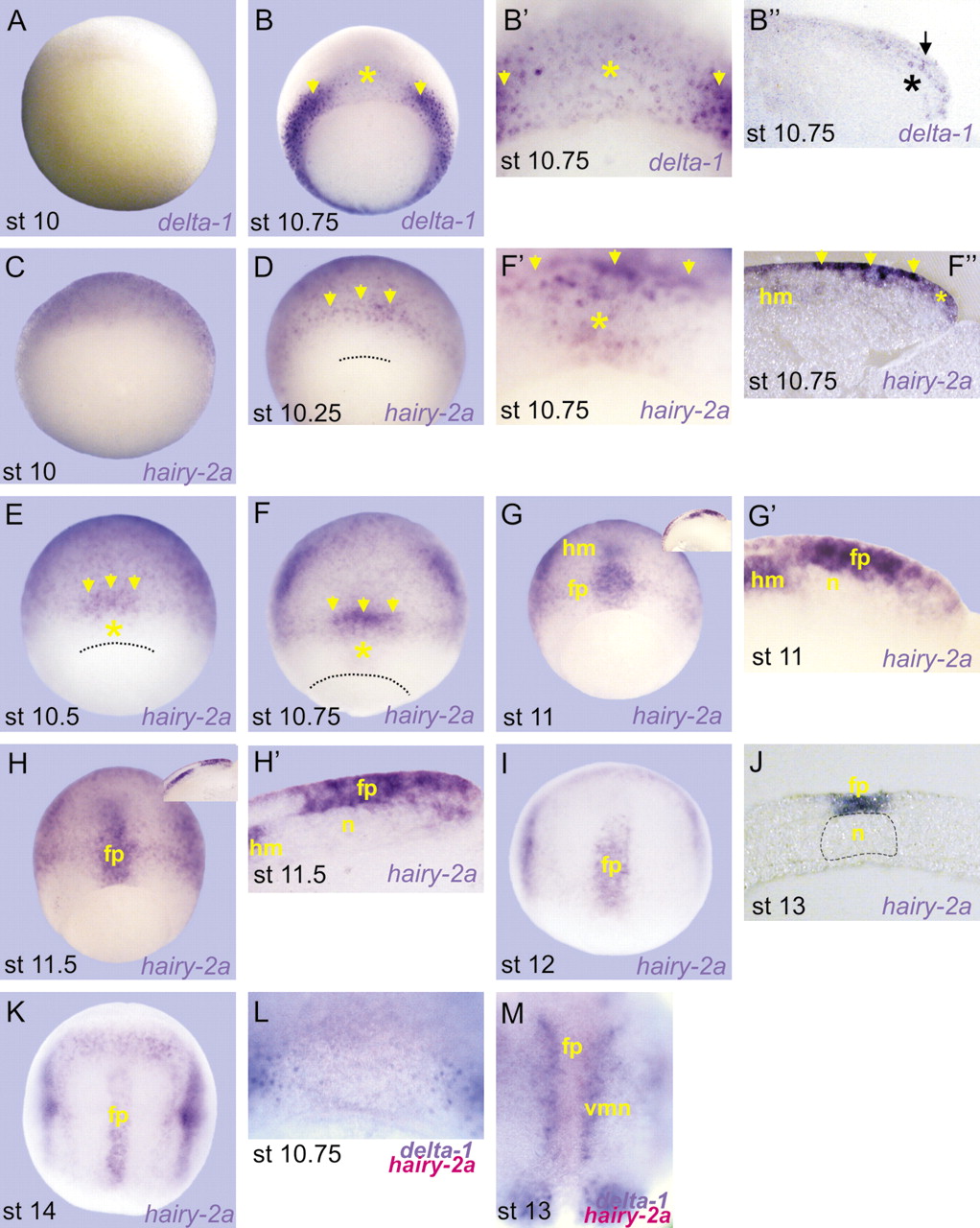 Fig. 1. Comparative expression patterns of delta1 and hairy2a. In situ hybridization of (A-Bâ²) delta1, (C-K) hairy2a, (L,M) delta1 (purple) and hairy2a (magenta) in control embryos. Stages (st) are indicated at the bottom of each figure; fp, prospective floor plate; n, notochord; hm, head mesoderm; vmn, delta1 stripe corresponding to the domain of developing primary ventral motor neurons; dotted line, dorsal blastoporal groove. The insets in G and H show low magnifications of the corresponding sagittal sections in Gâ²and Hâ². See text for details. |