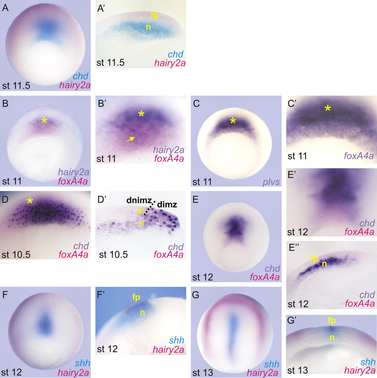 Fig. 2. Comparative expression patterns of hairy2a, chd, foxa4a and shh. Double in situ hybridization of (A-Aâ²), chd (turquoise) and hairy2a (magenta); (B,Bâ²) foxa4a (magenta) and hairy2a (purple); (D-Eâ²) chd (purple) and foxa4a (magenta); (F-Gâ²) shh (turquoise) and hairy2a (magenta). (C,Câ²) in situ hybridization of foxa4a. (Aâ²,Dâ²,Eâ²,Fâ²) Sagittal sections of the embryos shown in A,D,E,F respectively. (Gâ²) Transverse section of the embryo shown in G. Notice that in Fâ²,Gâ² the co-expression domain of shh and hairy2a in the FP can be distinguished because of the purplish colour resulting from the overlapping of magenta and turquoise staining. Stages (st) are indicated at the bottom of each figure; fp, prospective floor plate; n, notochord; dnimz, dorsal non-involuting marginal zone; dimz, dorsal involuting marginal zone; dotted line indicates the presumptive limit of involution. See text for details. |
