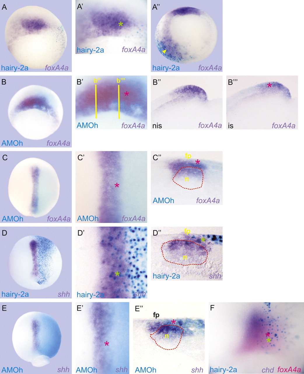 Fig. 5. hairy2a up-regulates foxa4a and shh in the FP precursors. (A) foxa4a expression (purple) in a gastrula dorsally injected with 0.25 ng of hairy2a mRNA (turquoise X-gal staining). (Aâ²) Higher magnification of A, revealing the increase of foxa4a+ cells in the notoplate precursors (green asterisk). (Aâ²) foxa4a expression (purple) in a gastrula ventrally injected with 1 ng of hairy2a mRNA (turquoise X-gal staining). The arrowhead points to the ectopic foxa4a+ cells in the ventral mesoderm region. (B,C) foxa4a expression (purple) in (B) gastrula or (C) neural plate stage embryos injected with 10 ng of AMOh, turquoise staining reveals the distribution of AMOh. (Bâ²,Câ²) Higher magnification of B and C, respectively. In Bâ² the yellow lines indicate the plane of the parasagittal sections shown in Bâ² and Bâ´, respectively. (Câ²) Transverse section of the embryo shown in C. (D) shh expression (purple) in a neurula injected with 0.25 ng of hairy2a mRNA (turquoise X-gal staining). (Dâ²) Higher magnification of D, revealing the increase of shh+ superficial cells corresponding to the prospective FP. (Dâ²) Transverse section of the same embryo shown in D. Notice the increase of shh+ cells in the FP domain on the injected side (green asterisk). (E) shh expression (purple) in a neurula injected with 10 ng of AMOh, turquoise staining reveals the distribution of AMOh. (Eâ²) Higher magnification of E, revealing the decrease of shh+ superficial cells corresponding to the prospective FP. (Eâ²) Transverse section of the embryo shown in E. Notice the decrease of shh+ cells in the FP domain on the injected side (red asterisk). (F) Expression of chd (purple) and foxa4a (magenta) in a late gastrula embryo injected with 0.25 ng of hairy2a mRNA (turquoise X-gal staining). nis, non-injected side; is, injected side; fp, prospective floor plate; n, notochord. The dotted red line demarcates the notochord. See text for details. |