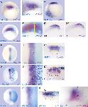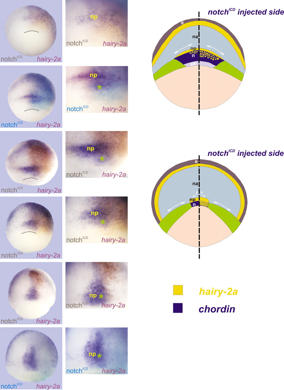 Fig. 7. Model interpreting the Notch-mediated cell-fate switch in the DML precursors. (Left) hairy2a expression (purple) in a developmental series of gastrula embryos injected with 1 ng of notchICD mRNA (brown or turquoise c-myc staining): left column, whole embryos; right column, higher magnification of the notoplate region. In all embryos the injected side is oriented to the right. (Right) Scheme illustrating the molecular and cellular changes on DML precursors after notchICD mRNA injection. See text for details. e, prospective epidermis; na, neural anlage; np, notoplate; n, notochord; ph, pharyngeal mesendoderm; white arrows, convergent-extension movements. |