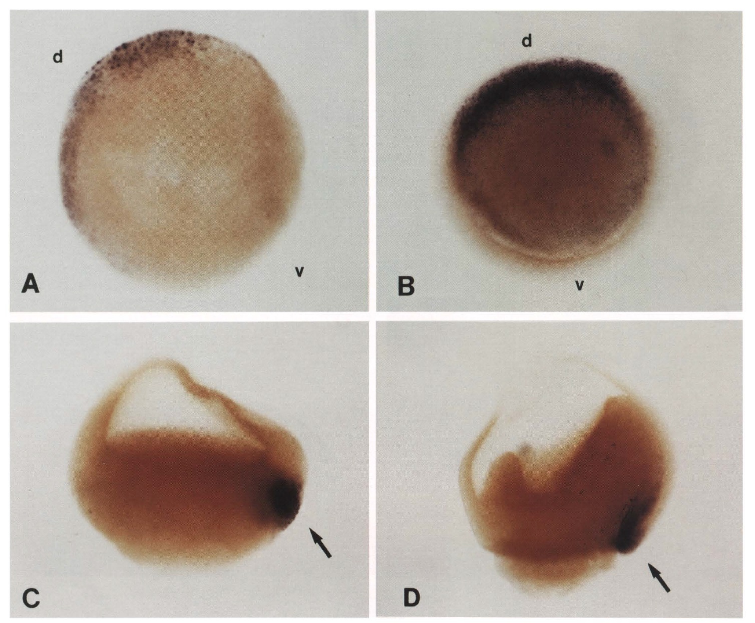 intense hybridization in the dorsal marginal zone in this vegetal view of the embryo, (d) Dorsal; (v) ventral. (C) Lateral view of a stage