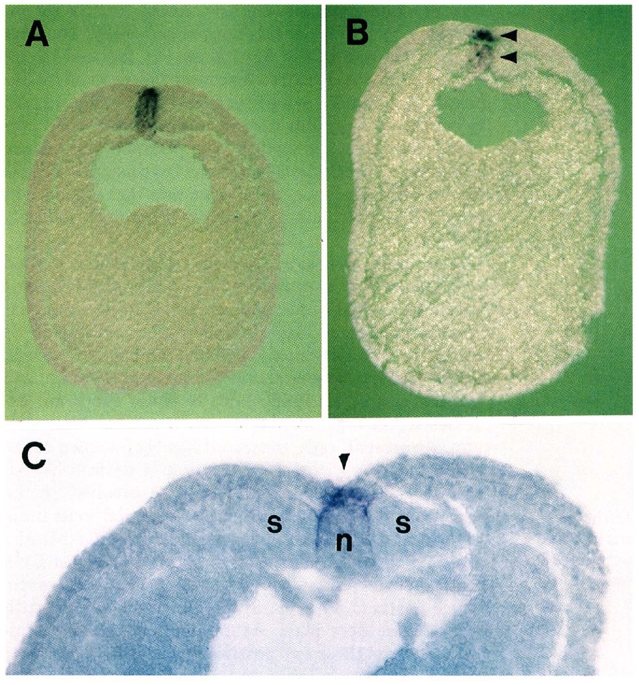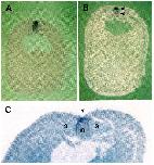 Figure 4. Whole-mount in situ hybridization of XFKHl to Xenopus neurulae. [A] Dorsal view of stage 12 embryo showing the extent