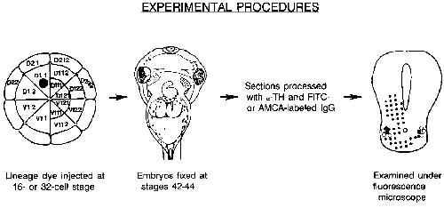 TRA injected into one blastomere. In the fur right diagram, which represents a frontal section of the diencephalon, solid circles indicate the location