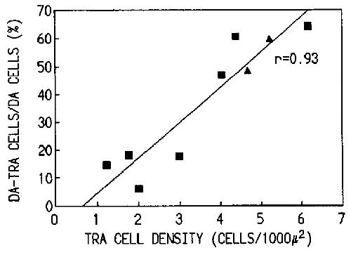 of members of the TRA-labeled clone, open circles indicate TH-positive cells, and dense-cored circles indicate double-labeled (DA-TRA) cells.