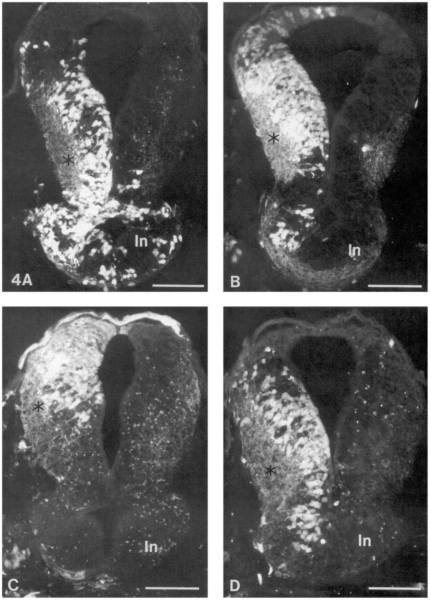 Figure 4. Transverse sections illustrating the different distribution patterns of TRA-labeled cells in the stage 43 forebrain, including the infundibulum (In). Asterisks indicate the labeled axon tracts. A, A typical distribution of Dl. 1.1 clone with dense ventral labeling and many contralateral cells. B, In other cases of D 1.1.1 clones, the TM-labeled cells are more dorsally located and scattered in small numbers in the hypothalamus. C, Usually, the descendants of Dl.2 and its daughters are located in the dorsal and intermediate forebrain. D, In some cases, the Dl.2 clone shifts ventrally and enters the hypothalamus. Scale bars, 100 um.