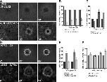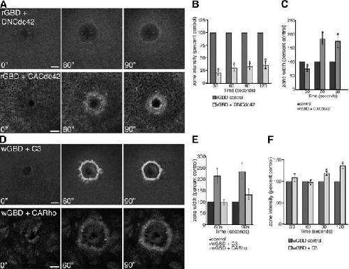 Figure 6. Crosstalk and rho GTPase zones. (A) Montage shows a decrease in RhoA activity zone intensity (rGBD) in the presence of DNCdc42 and an increase in zone width in the presence of CACdc42 (time in seconds). Bars, 10 μm. (B) Quantification of rGBD zone fluorescence intensity over time in the presence of DNCdc42 relative to controls (n = 8; results are shown as means ± SEM; asterisks indicate P < 0.05). (C) Quantification of rGBD zone width over time in the presence of CACdc42, relative to controls (n = 11; results are shown as means ± SEM; asterisks indicate P < 0.05). (D) Montage shows an increase in Cdc42 activity zone intensity (wGBD) in the presence of C3 and an increase in zone width with both C3 and CARho (time in seconds). Bars, 10 μm. (E) Quantification of wGBD zone signal width over time in the presence of C3 or CARho, relative to controls (n ≥ 4; results are shown as means ± SEM; asterisks indicate P < 0.05). (F) Quantification of wGBD zone fluorescence intensity over time in the presence of C3, relative to controls (n = 8; results are shown as means ± SEM; asterisks indicate P < 0.05). |