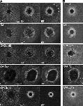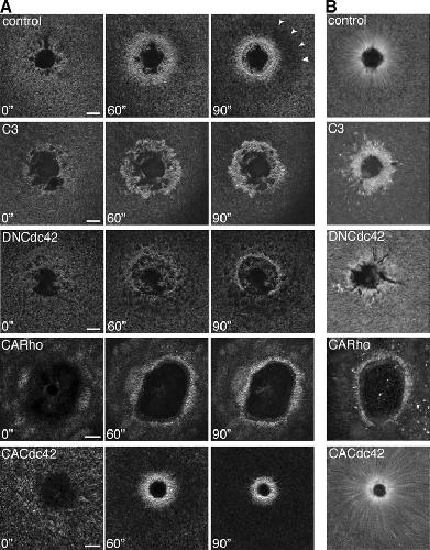 Figure 8. Contributions of rho GTPases to actin assembly and closure. (A) Montage shows varied appearance and dynamics of actin in cells treated with either C3, DNCdc42, CARho, or CACdc42, compared with control (arrowheads indicate the outer edge of the dark halo in control). Bars, 15 μm. (B) Montage of brightest point projections made from movies (available at http://www.jcb.org/cgi/content/full/jcb.200411109/DC1) shows that movement of individual actin filament clusters around wounds is greatly reduced in cells treated with C3, DNCdc42, or CARho, but increased with CACdc42, compared with control. Videos available at http://www.jcb.org/cgi/content/full/jcb.200411109/DC1. |