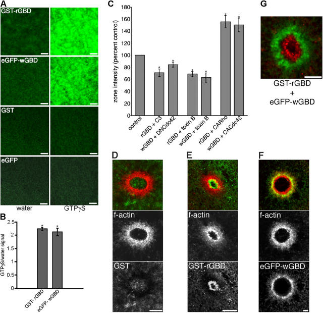 Figure 1. Endogenous and exogenous rho GTPase activity in resting and wounded oocytes. (A) Confocal images of plasma membrane (PM) fluorescence of oocytes injected with a GBD probe, GST, or eGFP, and subsequently injected with water or GTP-γ-S. Bars, 10 μm. (B) Quantification of PM fluorescence signal in oocytes containing the indicated probes and injected with water or GTP-γ-S (n = 30; results are shown as means ± SEM; asterisks indicate P < 0.001). (C) Quantification of background fluorescence intensity in resting oocytes containing the indicated probes and toxin B, C3 exotransferase (C3), or the specified construct, compared with controls containing the probes alone (n ≥ 3; results are shown as means ± SEM; asterisks indicate P < 0.001). (D) Confocal images show lack of GST (green) localization around a wound relative to F-actin array (red). Bar, 10 μm. (E) Confocal images show ringlike localization of GST-rGBD (green) on interior of F-actin array (red). Bar, 10 μm. (F) Confocal images show ringlike colocalization of eGFP-wGBD (green) with F-actin array (red). Bar, 10 μm. (G) Confocal image shows zone of GST-rGBD (red) encircled by that of eGFP-wGBD (green). Bar, 10 μm. |
