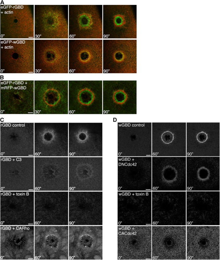 Figure 2. Rho GTPase activity zone dynamics. (A) Montage shows that zone of RhoA activity (eGFP-rGBD; green) appears as broad zone before focusing into a tight ring on actin array interior (red), whereas Cdc42 activity (eGFP-wGBD; green) appears and is maintained as a narrow zone in the middle of the actin array during wound healing (time in seconds; see Fig. S1). Bars, 15 μm. (B) Montage shows that RhoA (eGFP-rGBD; green) and Cdc42 (mRFP-wGBD; red) segregate into discrete zones during wound healing (time in seconds). Bar, 10 μm. (C) Montage shows that RhoA zone intensity (rGBD) is greatly reduced in the presence of C3 exotransferase (C3), toxin B, or constitutively active Rho (CARho), compared with control (time in seconds). Bars, 10 μm. (D) Montage shows that Cdc42 zone intensity of activity (wGBD) is greatly reduced in the presence of dominant negative Cdc42 (DNCdc42), toxin B, or constitutively active Cdc42 (CACdc42), compared with control (time in seconds). Bars, 10 μm. Videos available at http://www.jcb.org/cgi/content/full/jcb.200411109/DC1. |