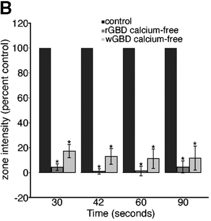 Figure 3. External calcium is required for local activation of RhoA and Cdc42. (A) Montage shows suppression of RhoA (eGFP-rGBD) and Cdc42 (mRFP-wGBD) activity zones at 90 s after wounding in calcium-free medium. Bars, 10 μm. (B) Quantification of GBD zone fluorescence intensity in the absence of external calcium, relative to controls, over time (n = 11; results are shown as means ± SEM; asterisks indicate P < 0.001). |