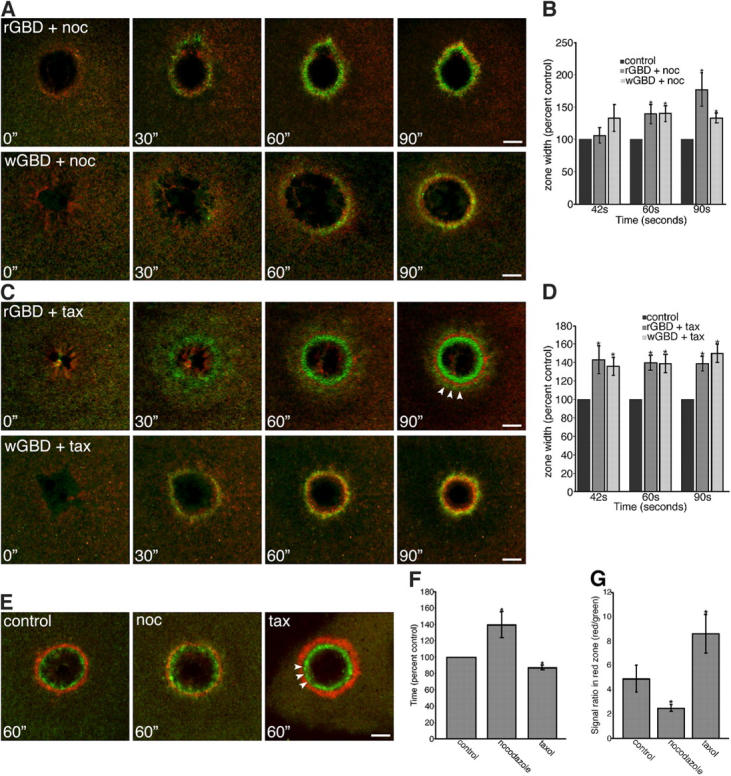 Figure 5. Microtubules and rho GTPase activation. (A) Montage shows the broadening of RhoA (rGBD) or Cdc42 (wGBD; green) activity relative to actin (red) in cells treated with nocodazole (noc; time in seconds). Bars, 10 μm. (B) Quantification of GBD zone width over time in the presence of nocodazole, relative to controls (n = 3; results are shown as means ± SEM; asterisks indicate P < 0.05). (C) Montage shows the broadening of RhoA (rGBD) or Cdc42 (wGBD; green) activity zones relative to actin (red) in cells treated with taxol (tax; arrowheads show rGBD signal on the outside of the actin array; time in seconds). Bars, 10 μm. (D) Quantification of GBD zone width over time in the presence of taxol, relative to controls (n = 3; results are shown as means ± SEM; asterisks indicate P < 0.05). (E) Montage shows the segregation of RhoA (rGBD; green) and Cdc42 (wGBD; red) activity zones at 60 s after wounding in control and nocodazole- and taxol-treated cells (arrowheads show gap between zones in taxol). Bar, 10 μm. (F) Quantification of the time needed for GBD zone segregation in the presence of nocodazole or taxol, compared with controls (n = 11; results are shown as means ± SEM; asterisks indicate P < 0.05). (G) Quantification of zone segregation, comparing signal ratio (red/green; mRFP-wGBD/eGFP-rGBD) in the red zone, of controls and oocytes treated with nocodazole or taxol (n = 9; results are shown as means ± SEM; asterisks indicate P < 0.05). |