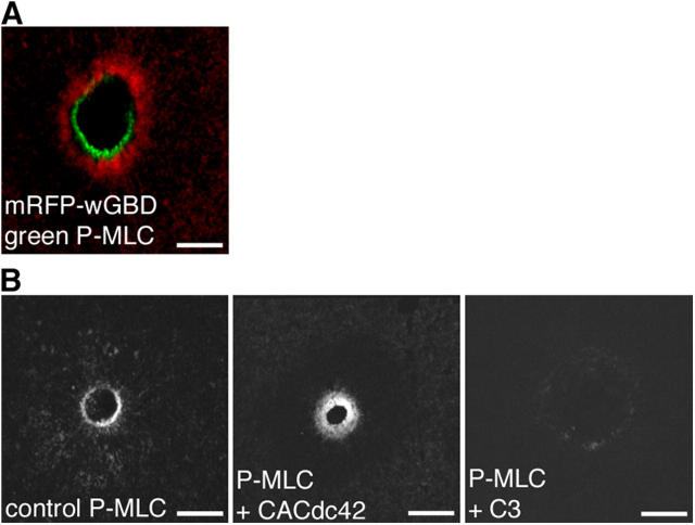 Figure 7. Activity zones and myosin-2 light chain phosphorylation. (A) Confocal image shows phosphorylated myosin-2 regulatory light chain staining (P-MLC; green) circumscribed by Cdc42 activity (red) in a fixed cell. Bar, 25 μm. (B) Confocal images of fixed cells show that P-MLC staining is broadened in cells treated with CACdc42 and reduced with C3, compared with control, at 3 min after wounding. Bars, 25 μm. |