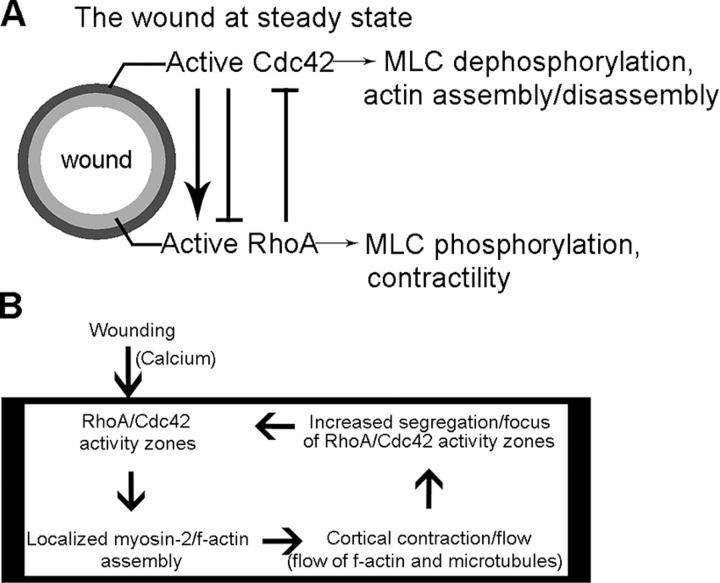 Figure 9. Summary, crosstalk, and working model for observed discrete localization of rho GTPase activity zones during wound healing. (A) Schematic shows observed concentric subcellular compartmentalization of RhoA and Cdc42 activity zones at wound border, summary of crosstalk, and their respective effects on actin dynamics. (B) Diagram shows working model for maintenance of wound-induced response. Upon wounding, a cytoplasmic activity module (inside box) is established in which activation of localized RhoA and Cdc42 leads to directed cortical contraction and flow, which cause accumulation of both actin and microtubules, which, in turn, further promotes zones of activity. |