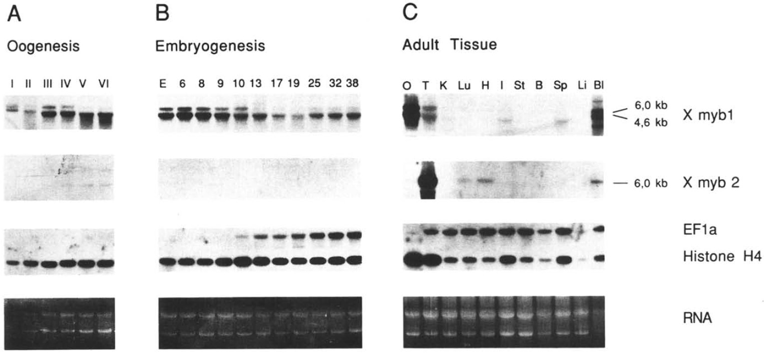 Fig. 4. RNA profiles for Xmybl and Xmyb2 in Xenopus development. (A) Oogenesis. Four cell equivalents of total RNA from stages of