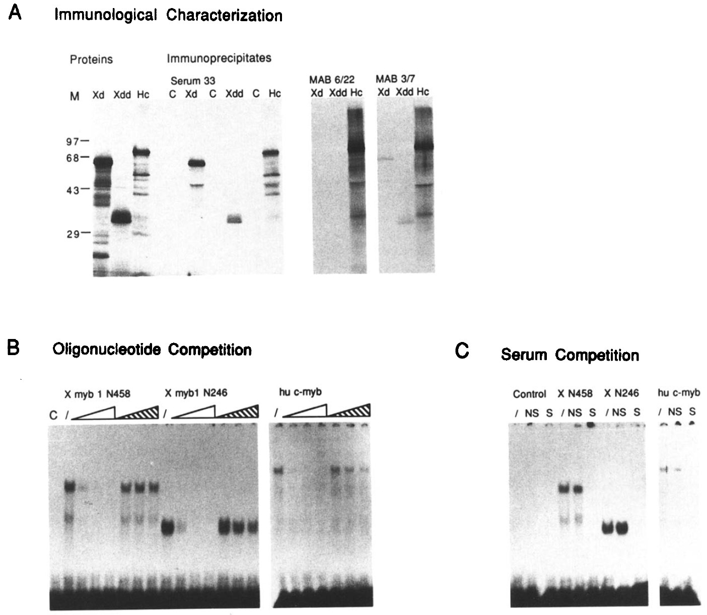 interaction shown in (B) with antiserum against hu c-Myb protein was performed using the sheep serum $33 (S) and a negative hyperimmune