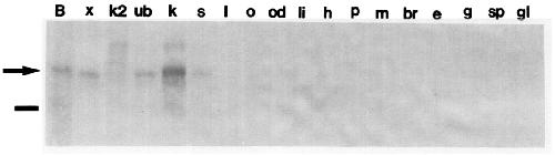 eye; g, gut; sp, spleen; gl, gall bladder. The arrow indicates the llO-kDa major band and the bar indicates the location of the 9%kDa marker.