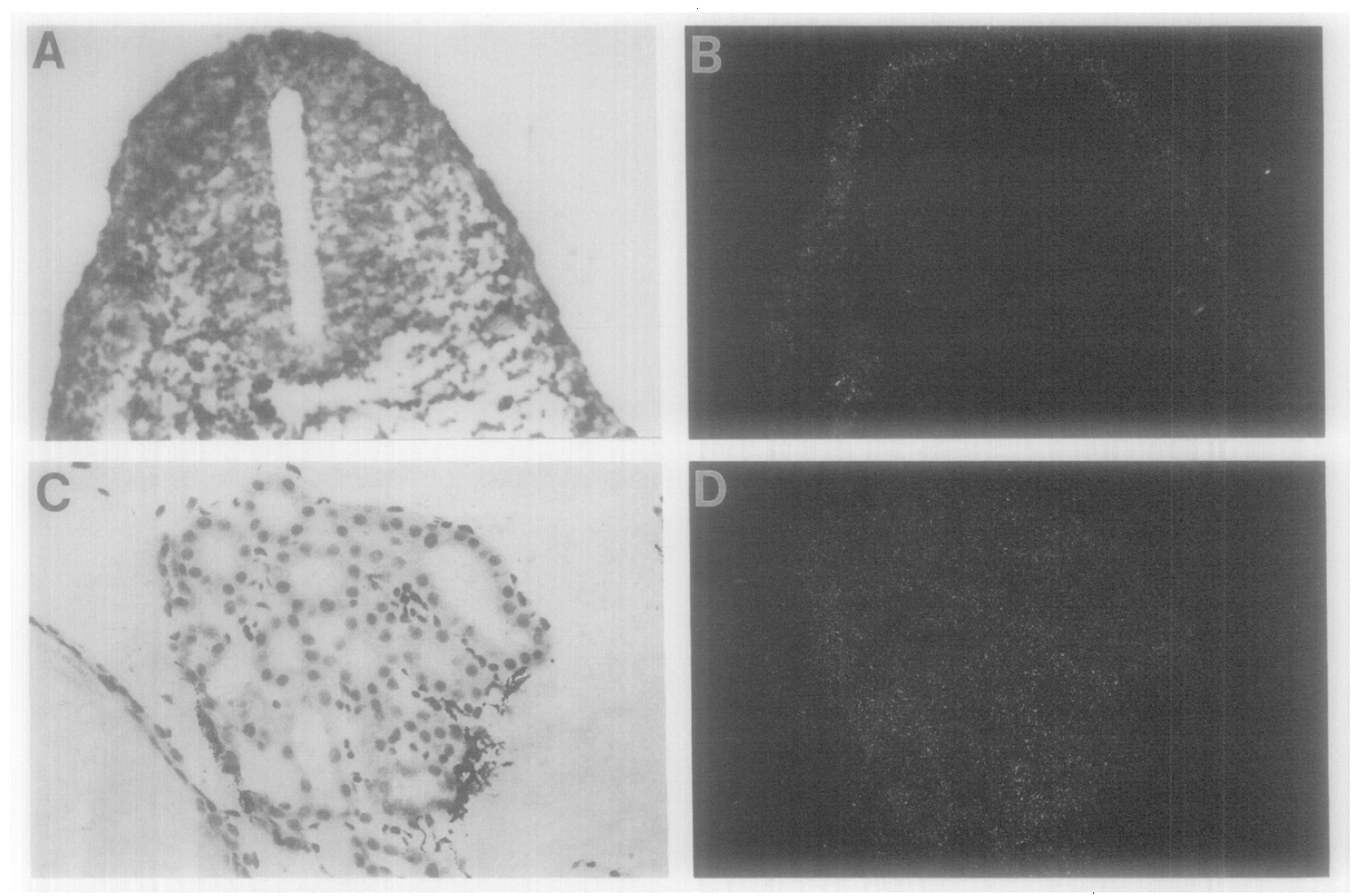 was no specific hybridization with control, sense RNA probes (data not shown). Magnification (Magn.) of A and B is 100X. Magn. of C and D is 250x |