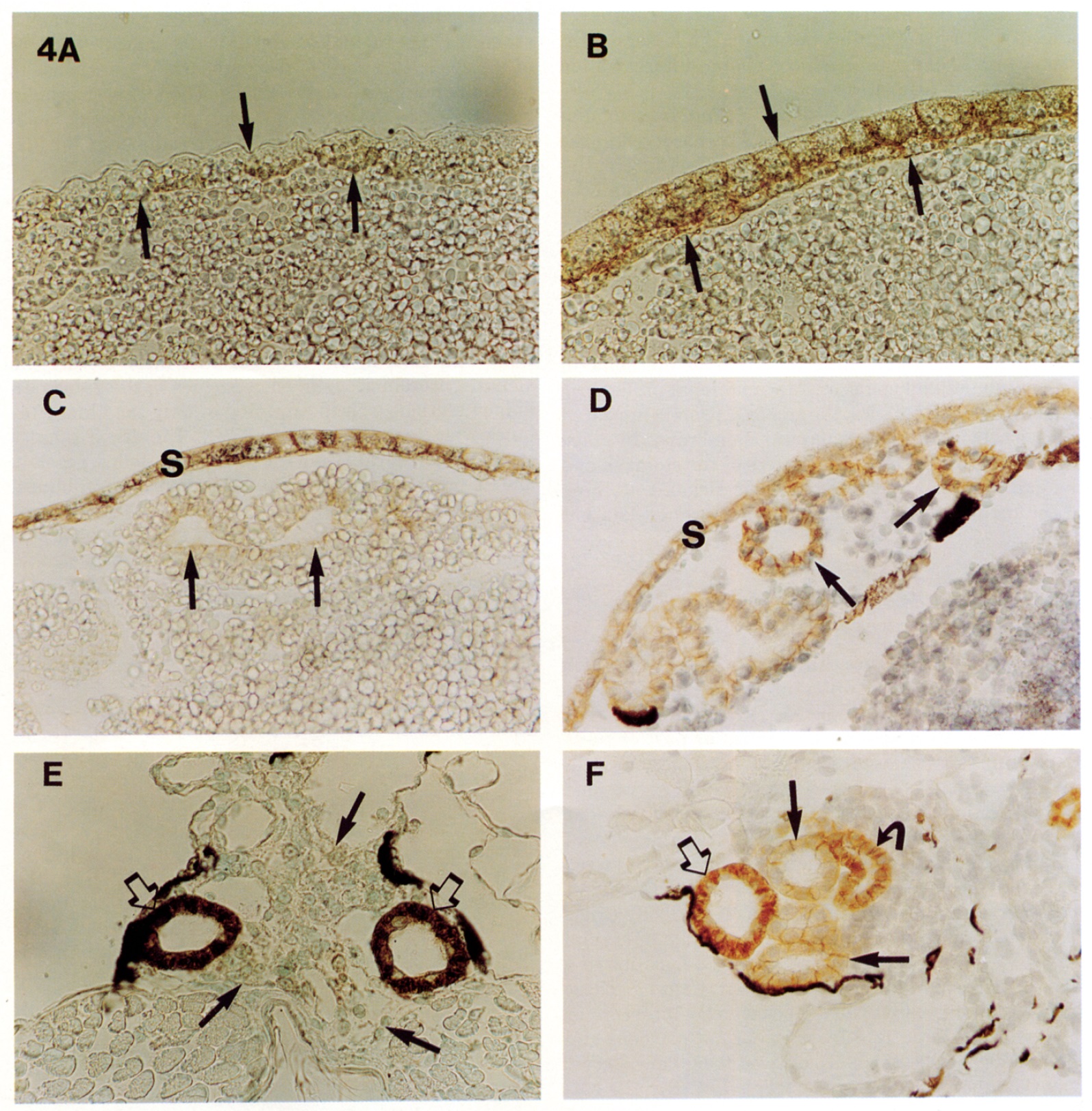 FIG. 4. Accumulation of xlcaax-1 protein in differentiated skin, pronephros and mesonephros. Immunocytochemistry of embryonic tissue sections stained with the L13 pAb. (A) Stage 15/16 embryos, arrows indicate undifferentiated outer ectoderm. (B) Stage 23/24 embryo, arrows indicate differentiated epidermis with basolateral xlcaax-1 staining. (C) Stage 29136 embryo, arrows indicate pronephric tubules in initial stages of differentiation. (D) Stage 35 embryo, arrows indicate differentiated pronephric tubules. (E) Stage 47/48 embryo, arrows indicate undifferentiated mesonephric tissue, open arrows indicate the pronephric ducts. (F) Stage 49 embryo showing specific xlcaax-1 staining in the tubules, open arrow indicates the pronephric duct, curved arrow indicates the distal tubule, arrow indicates the proximal tubule, s, skin. Magn. is 500X. |