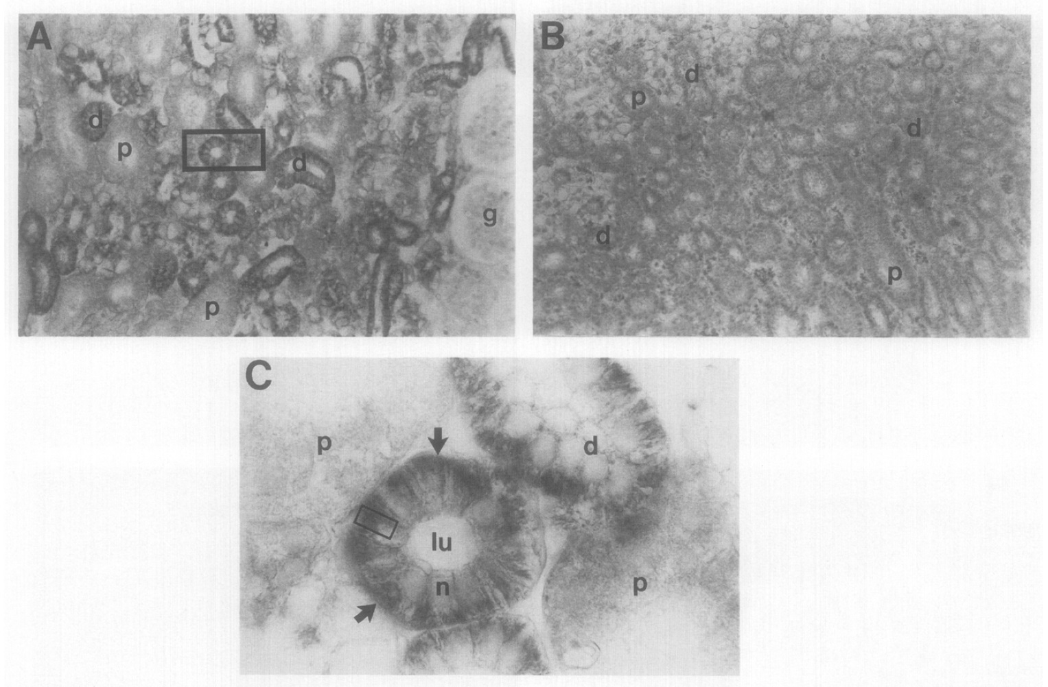 (B) Control section of adult kidney. (C) High magn. of boxed area in A, arrows indicate the basolateral membrane, box indicates region shown in