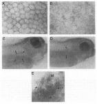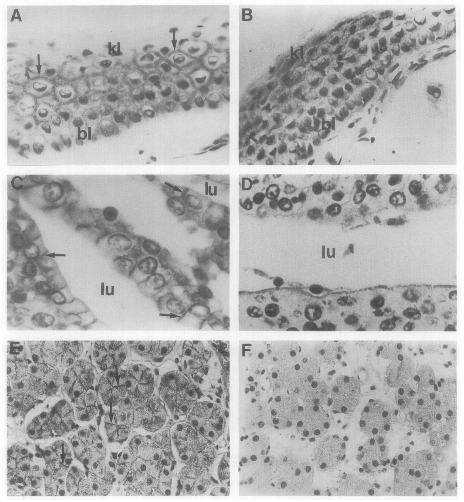 indicate the region of the lateral membranes. (F) Adjacent, control section of stomach parietal glands. Magn. of A and B is 1000X. Magn. of C