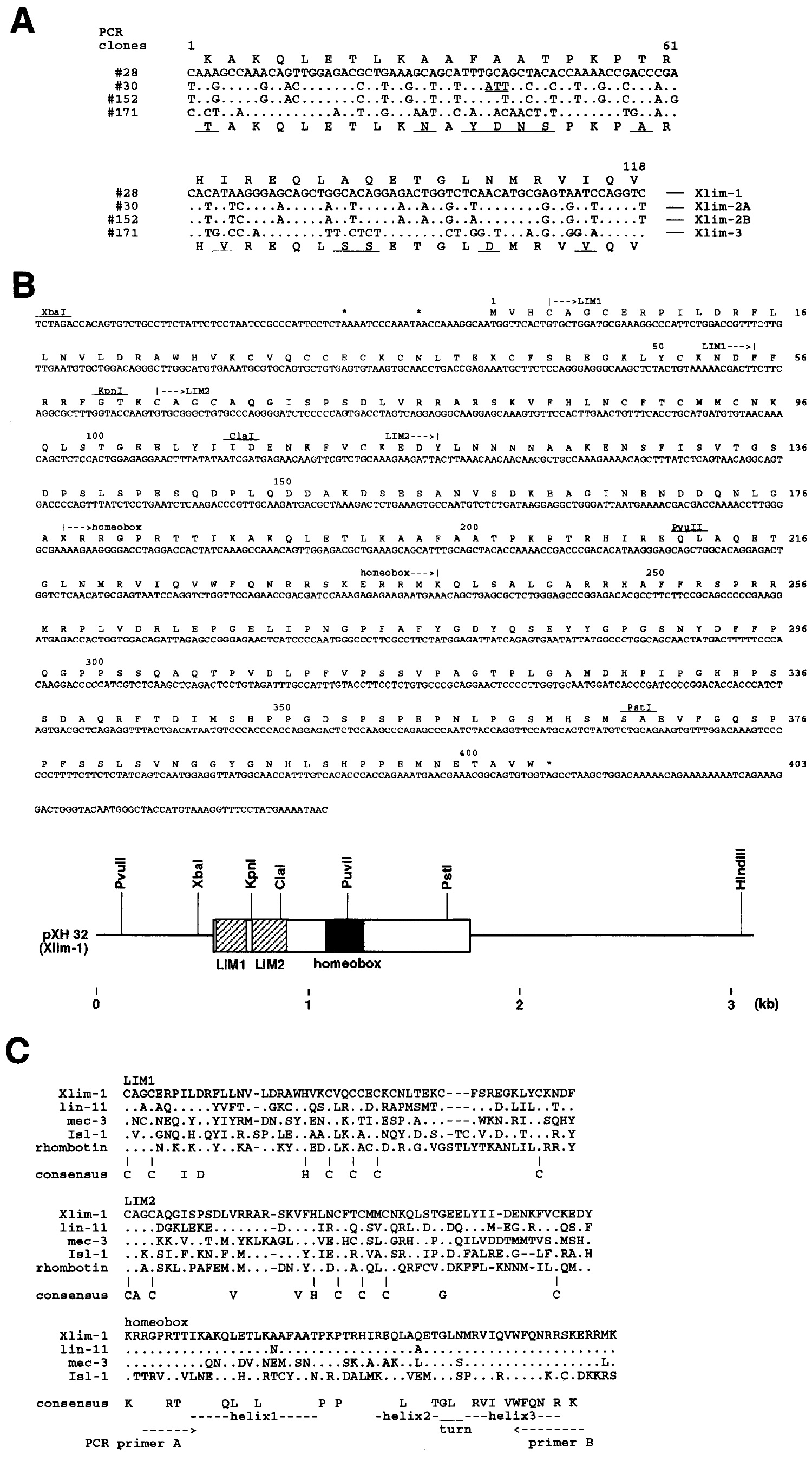 GenBank/EMBL accession number is X63889. (C) Comparison of LIMl, LIM2, and homeo box domains of Xlim-l, lin-11 (Freyd et al.