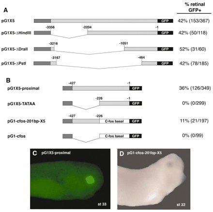 Deletion analysis isolates a proximalXath5 cis-regulatory region. (A) HindIII, DraII and PstI sites were used to delete regions of Xath5 genomic sequence in the pG1X5 construct. All three constructs drove strong transgene expression in the retina. (B) The pG1X5-proximal construct containing sequences from 27 to drove robust retinal expression of the transgene. The pG1X5-TATAA construct containing sequences from 26 to showed no expression. Xath5 sequence from 27 to 26, when fused to the Fos heterologous basal promoter (pG1-cfos-201bp-X5), drove retinal expression, but more weakly. The basal Fos promoter alone (pG1-cfos) did not confer retinal GFP expression. (C) A pG1X5-proximal transgenic embryo (stage 33) shows retinal GFP expression. (D) In situ hybridization of pG1-cfos-201bp-X5 (stage 32) transgenic embryo shows weak GFP expression in the retina.