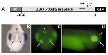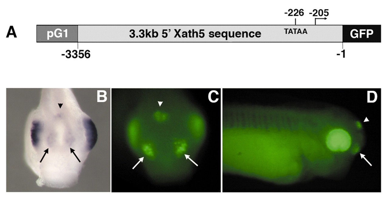 Fig. 1. Identification of a Xath5 regulatory fragment that functions in vivo. (A) The pG1X5 construct contains 3.3 kb of 5â² Xath5a genomic DNA cloned into the promoterless vector pG1 with a GFP reporter. The TATAA element is at â226 bp, the putative transcription start site is atâ 205 bp and the translation start site is at +1 bp. (B) In situ hybridization showing that endogenous Xath5 mRNA is expressed in the retina, the pineal gland (arrowhead), and the olfactory placodes (arrows) of a stage 28 embryo (frontal view). (C,D) Frontal and lateral views of a stage 28 transgenic pG1X5 embryo showing expression of the transgene in the same tissues as the endogenous Xath5 mRNA (compare with B).