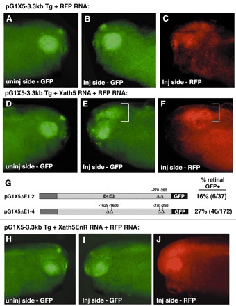 3.3 kb Xath5 transgene expression can be activated by bHLH factors, but is not dependent upon conserved E-boxes or bHLH activity. (A-C) Injection of RNA encoding RFP alone did not alter transgene expression on the injected side. (D-E) Injection of RNA for Xath5 ectopically activated transgene expression on the injected side (bracket in E) compared with the uninjected side (D). RFP marks the region targeted on the injected side (bracket in F). (G) Mutation of E1 and E2 (δE1,2) in the pG1X5-3.3 kb transgene did not eliminate retinal transgene expression. Mutation of two additional conserved E-boxes, E3 and E4, also did not abolish transgene activity. (H-J) Injection of RNA for the dominant-negative Xath5-EnR did not suppress expression of the pG1X5-3.3 kb transgene on the injected side (I) compared with the uninjected side (H). RNA encoding RFP (red) was co-injected to mark the injected side (J).