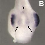 Expression bilaterally in retina of the eye, in olfactory placode ( arrows) and pineal gland (arrowhead).
