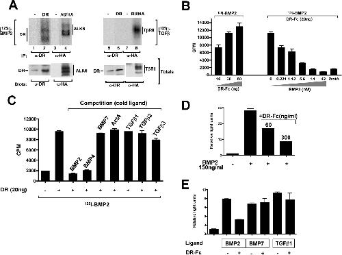 unlabeled BMP2, BMP4, BMP7, Activin A (ActA), TGF1, TGF2, and TGF3, and [125I]-BMP2 binding was measured. D, DRAGON-Fc reduces