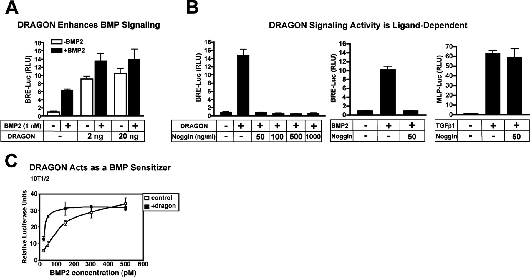 is represented as relative light units (RLU). DRAGON increases and potentiates BMP2-mediated signaling. B, DRAGON-mediated BMP signaling