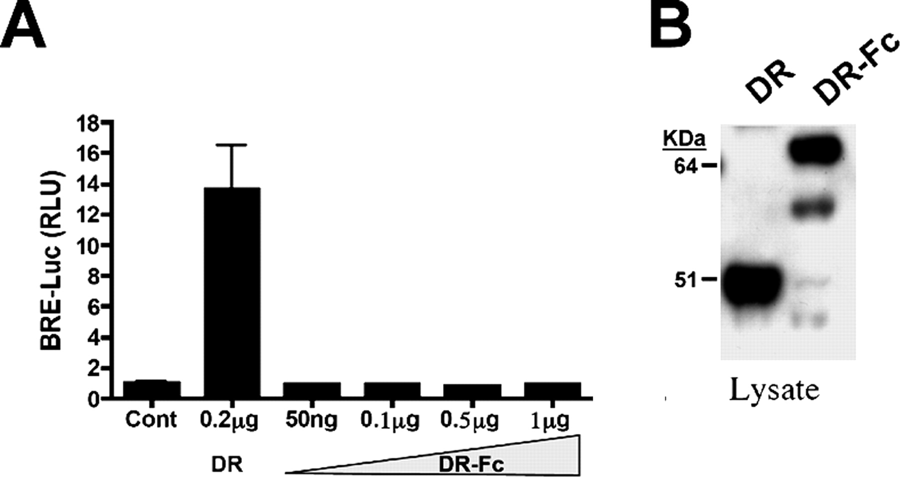 transfected with BRE-Luciferase construct (BRE-Luc) alone or in combination with 2 or 20 ng of a DRAGON expression construct. Luciferase