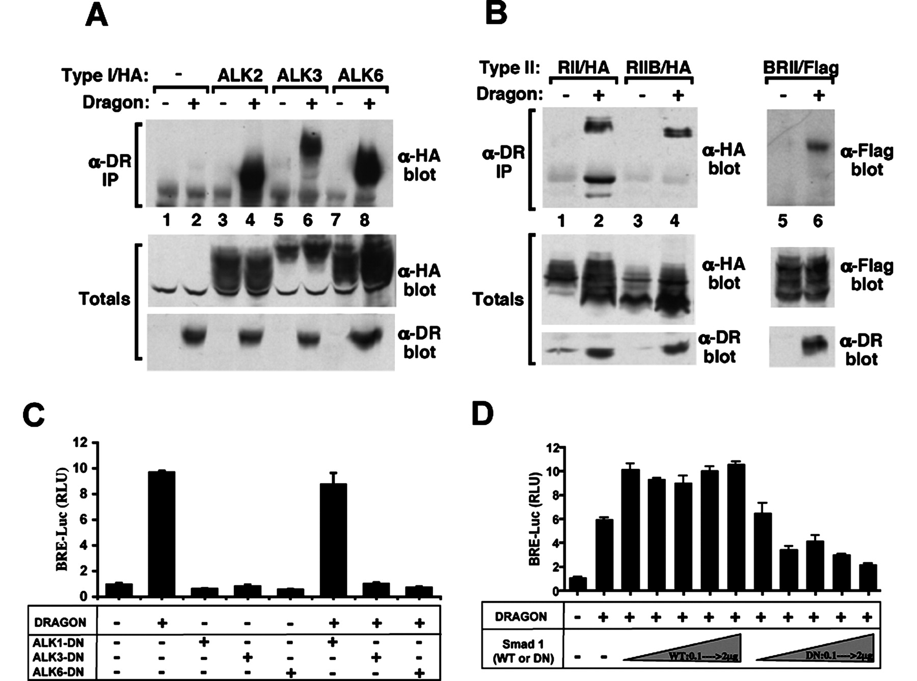 Protein expression was confirmed by anti-HA, anti-FLAG, and anti-Dragon immunoblotting of total cell lysates (bottom panels). C, ALK3-DN or