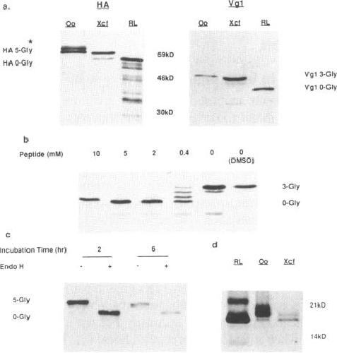 We describe the use of a Xenopus laevis egg extract for the in vitro translation and post translational modification of membrane and secretory proteins. This extract is capable of the translation and segregation into membranes of microgram per millilitre levels of protein from added mRNAs. Signal sequences of segregated proteins are efficiently cleaved and appropriate N-linked glycosylation patterns are produced. The extract also supports the quantitative assembly of murine immunoglobulin heavy and light chains into tetramers, and two events which take place beyond the endoplasmic reticulum, mannose 6 phosphorylation of murine cathepsin D and O-linked glycosylation of coronavirus E1 protein, also occur, but at reduced efficiency. The stability of the membranes allows protease protection studies and quantitative centrifugal fractionation of segregated and unsegregated proteins to be performed. Conditions for the use of stored extract have also been determined.