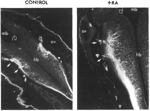 0.5/iM RA-treated embryos (right, +RA) stained with anti-neurofilament antibody. White arrows mark the three exit