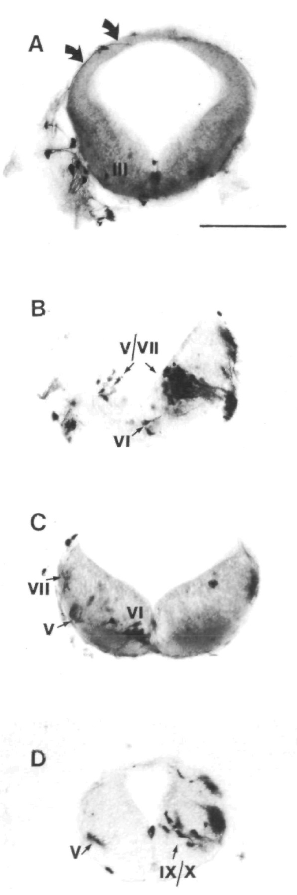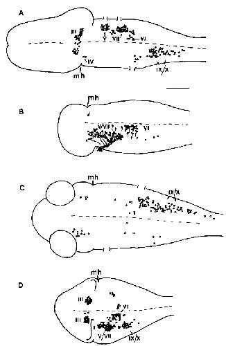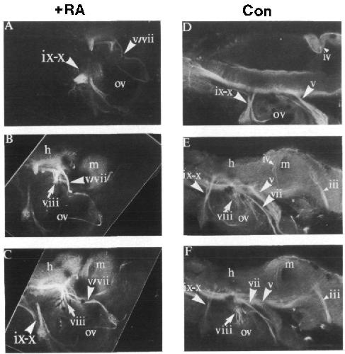 clearly define the Vth, Vllth, Vlllth and IXth/Xth nerve complexes. In the RA-treated embryos, only the Vllth, VHIth,