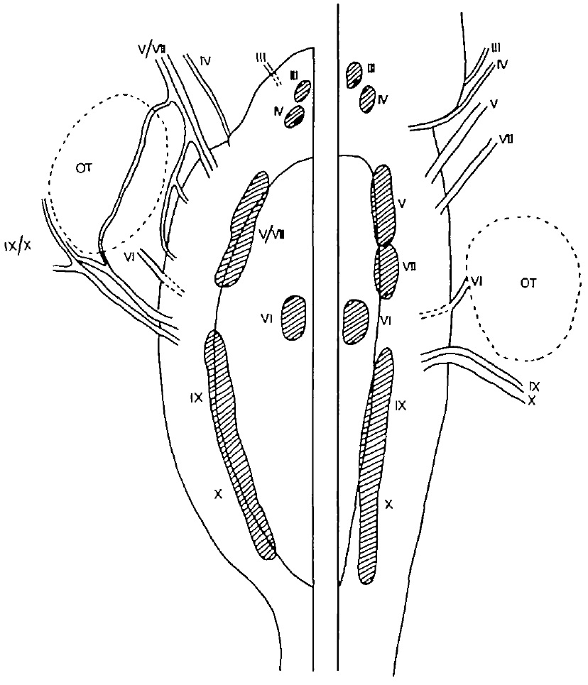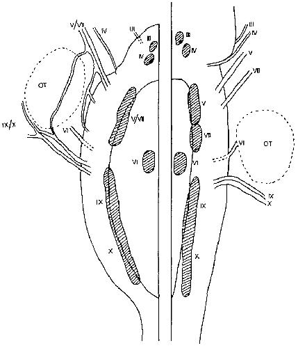the nuclei of III, V, VI, VTI, IX and X are relatively