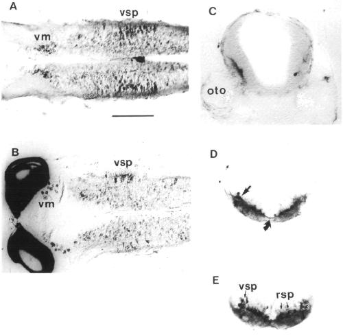ventral midbrain neurons; vsp, vestibulospinal neurons; rsp, reticulospinal neurons; oto, otocyst. Scale bar is 100 nm. |