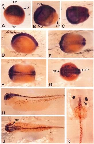 The signal can be identified on the dorsal side (O) and also in the ventral (V, presumptive epidermis) and lateral parts (YP yolk plug). (C) Late gastrula (stage