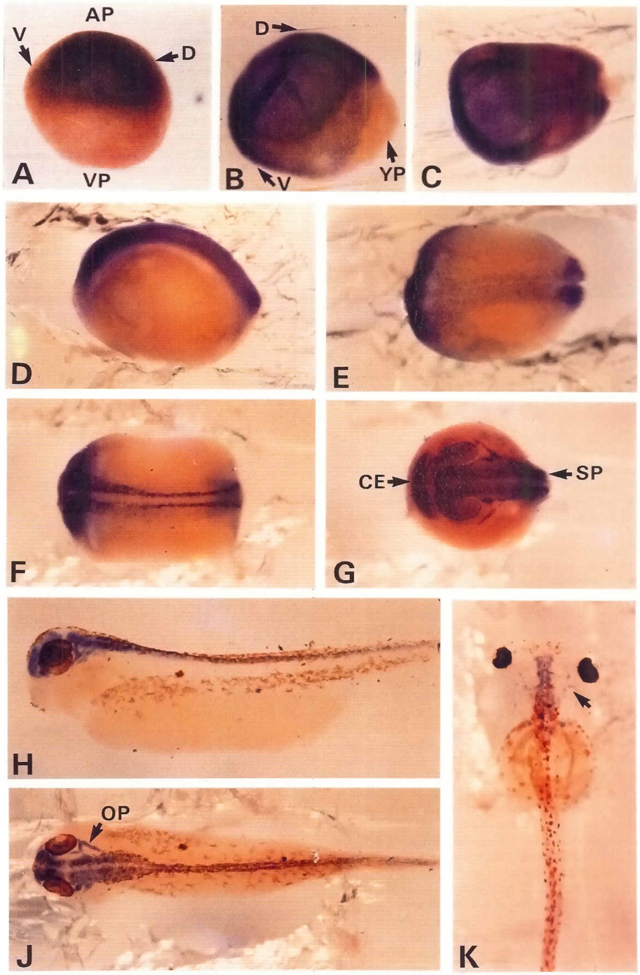 brain and spinal cord (SP) zone. A/so the presumptive cement gland (CE) /s stained. (H, J) Larval stage (stage 37; H lareral view, J dorsal view). The