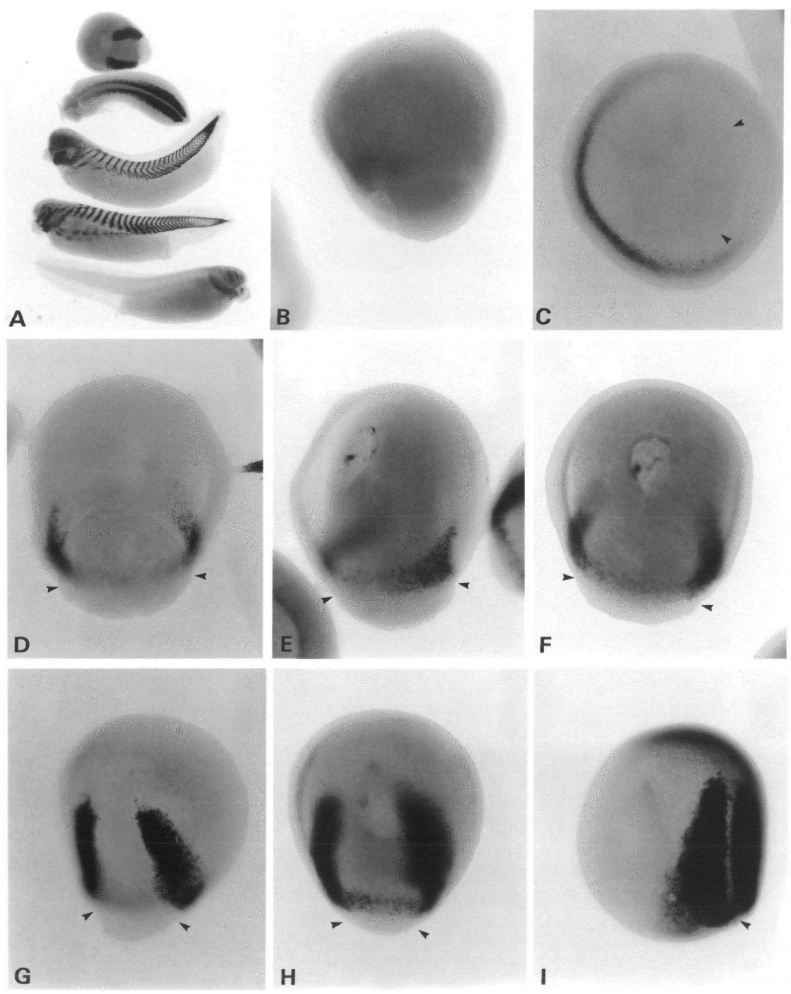 bottom of the picture. The blastopore lip is arrowed in D-I. (G,H) In situ hybridization to stage 13 neurulae. (G) Dorsal