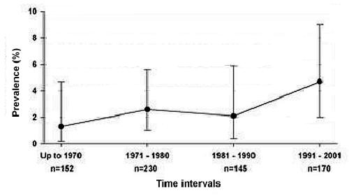 Figure 2. Historical time-trend of chytridiomycosis prevalence in southern Africa. No significant change was shown in the prevalence over time (p = 0.22, 95% confidence interval).
