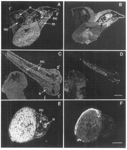 include notochord (B and D), somites, neural tube, and some endodermal cells (B). The scale bar in (F) also applies to (A), (B), and(E) and represents