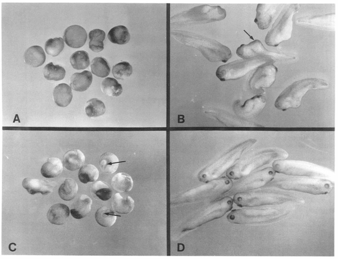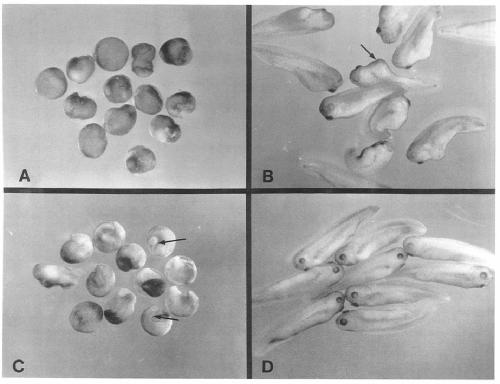 tadpoles are shown in (D). Arrows in (C) point to partial axial structures observed after activin RNA injections. Arrow in (B) points to a ventral bulge