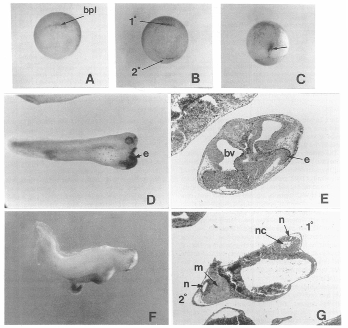 head structures (E) or a secondary axis with some neural and muscle tissue formed (G). Abbreviations are the same as for Figure 2 except that