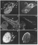 sectioned, and examined with darkfield (A, C, and E) and fluorescence optics (B, D, and F). (A), (B), (E), and (F) are transverse sections; (C) and