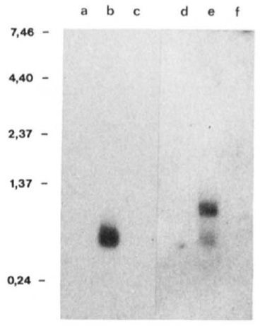 brain (lanes c and f) with the radioactively labeled inserts of eDNA