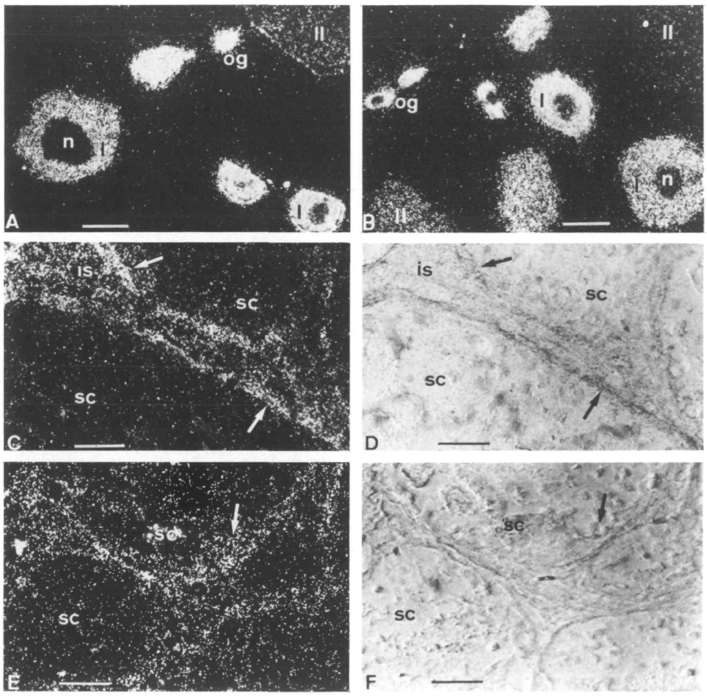 signal. A-C and E, dark-field illumination; D and F, bright-field illumination. Scale bars correspond to 50um.